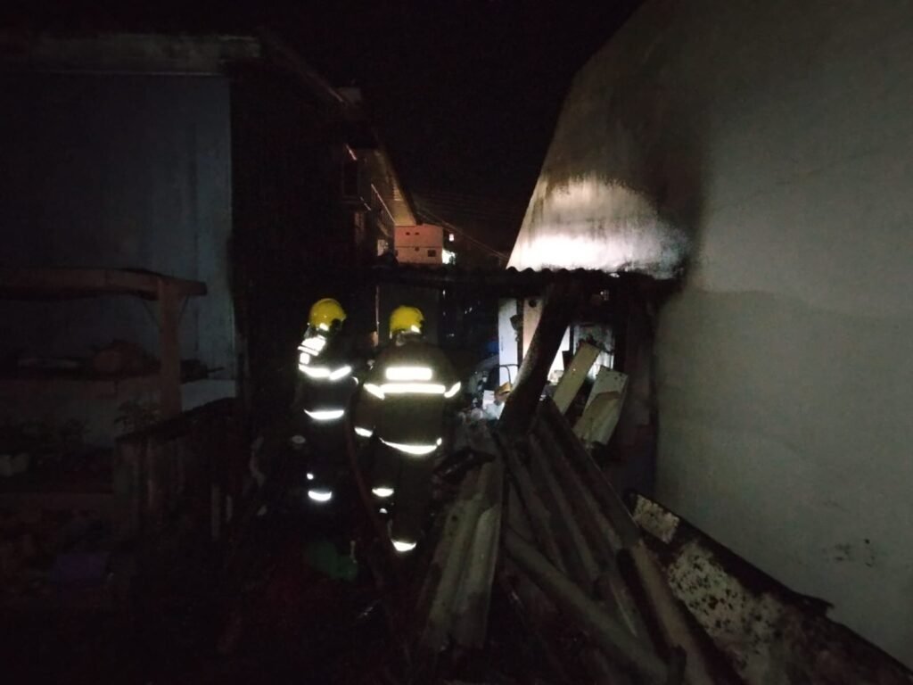No local, os bombeiros encontraram um foco de incêndio já em fase de controle em um depósito externo de aproximadamente 10 m², onde estavam armazenados materiais altamente combustíveis, como sofá, pneus, caixas de papelão e armários de madeira. O fogo havia sido contido inicialmente por populares e vizinhos, que utilizaram mangueiras de jardim.
