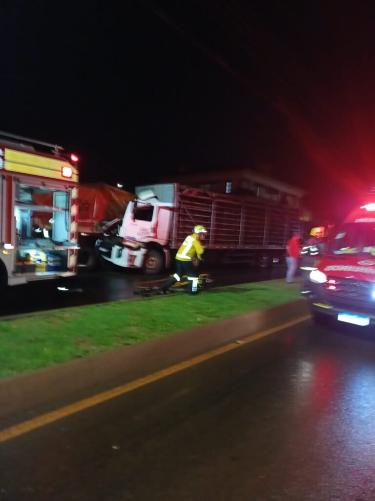 Por volta das 00h35 desta segunda-feira (08), equipes de socorro de Itapiranga/SC foram acionadas para atender um acidente de trânsito envolvendo dois caminhões na Avenida Uruguai, próximo à fábrica de ração da JBS.