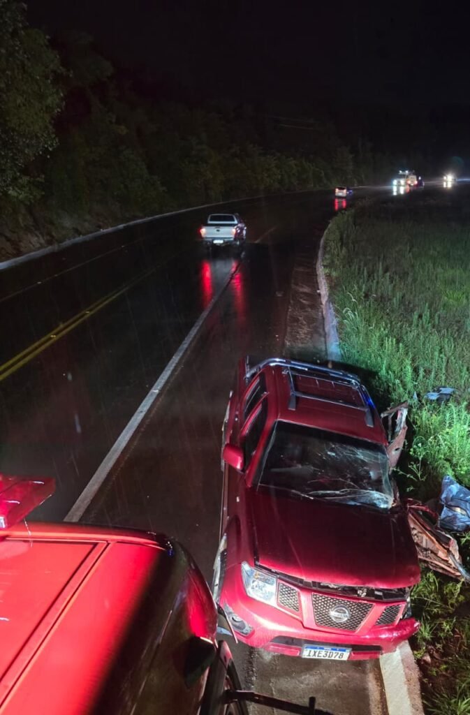 A segunda vítima, um homem maior de idade e condutor da caminhonete, foi encontrada inconsciente, sem sinais vitais, já em óbito, preso às ferragens no interior do veículo. A guarnição realizou o desencarceramento da vítima fatal.