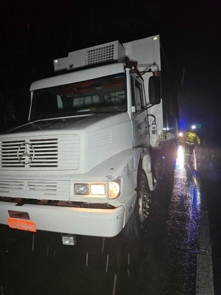 No local, foi confirmada uma colisão frontal/lateral envolvendo um caminhão e uma caminhonete Nissan Frontier. No caminhão havia uma vítima, um homem maior de idade, que se encontrava consciente, orientado, sem queixas e sem lesões aparentes. Ele foi localizado fora do veículo, caminhando pela pista, recusou atendimento médico e permaneceu no local.
