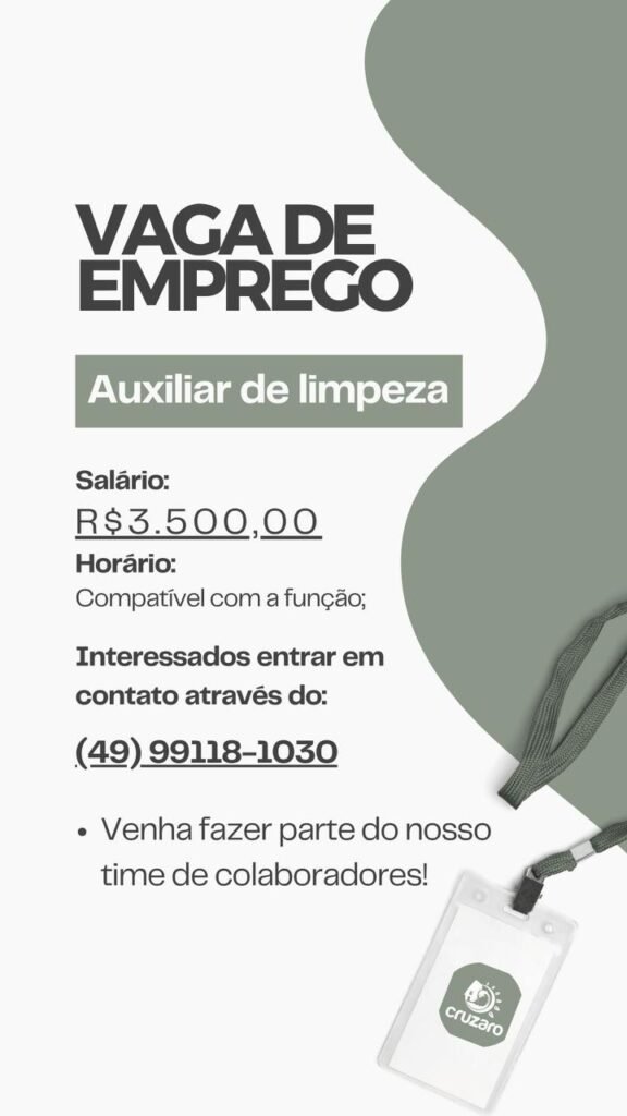 O Complexo de Lazer Cruzaro está com oportunidade aberta para auxiliar de limpeza. A vaga oferece salário mensal de R$ 3.500,00, com horário de trabalho compatível com a função.