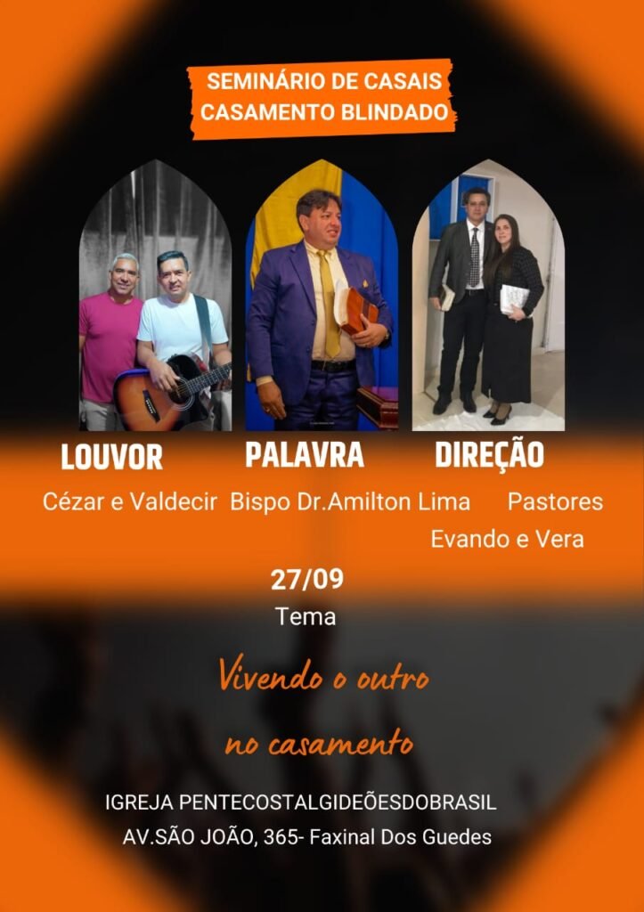 A Congregação da Igreja Gideões Missionários do Brasil, em Faxinal dos Guedes, promove no próximo sábado (27), às 19h30, o Seminário de Casais – Casamento Blindado. O encontro tem como objetivo fortalecer relacionamentos por meio de momentos de fé, aprendizado e convivência.