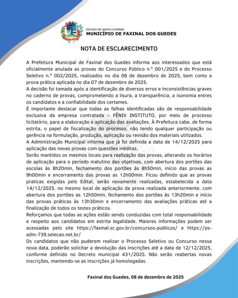 A Prefeitura de Faxinal dos Guedes divulgou uma nota oficial nesta segunda-feira (8) informando a anulação das provas do Concurso Público nº 001/2025 e do Processo Seletivo nº 002/2025, realizadas em 6 de dezembro de 2025, além da prova prática aplicada em 7 de dezembro.