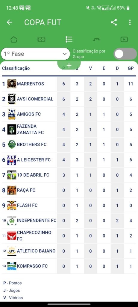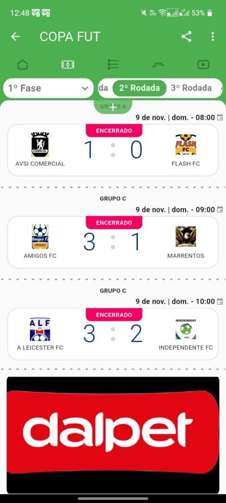 A primeira partida iniciou às 8h, com vitória da VSI Comercial por 1 a 0 sobre a Flash FC. Às 9h, o confronto entre Amigos FC e Marrentos terminou em 3 a 1 para o Amigos FC. No terceiro jogo, às 10h, a Leicester FC venceu o Independente FC por 3 a 2. Encerrando a rodada, às 11h, o Brothers FC empatou em 2 a 2 com a Fazenda Zanata FC.